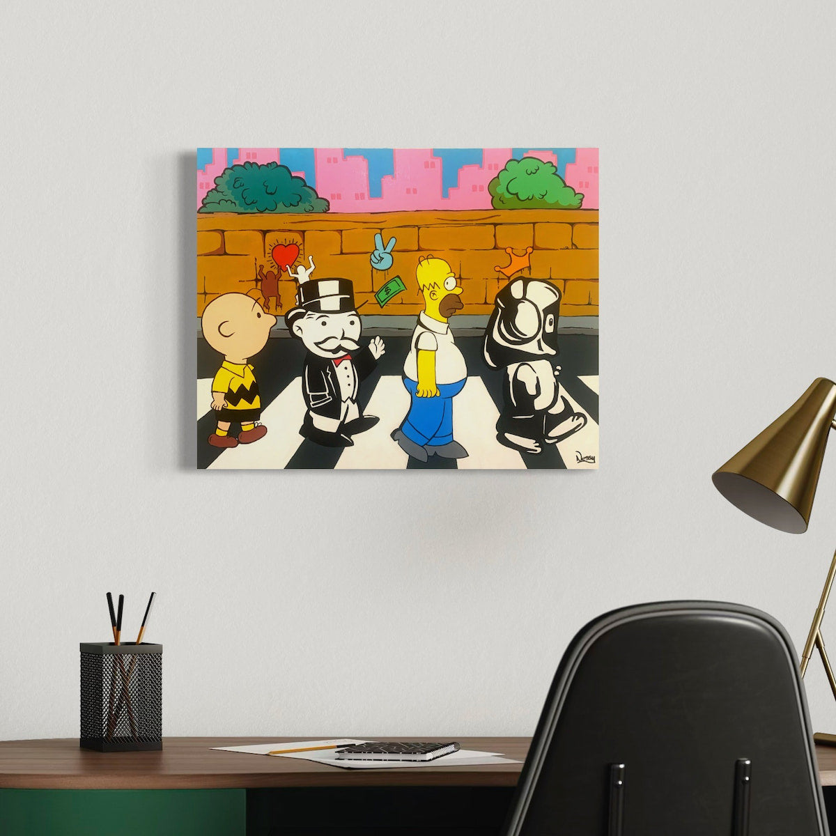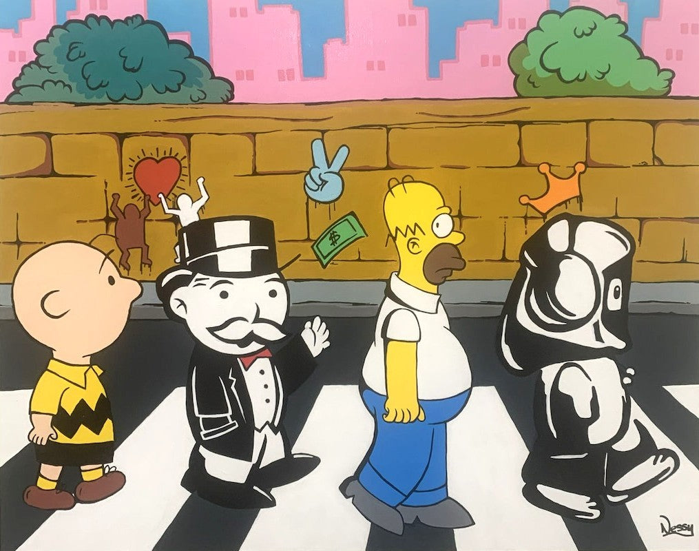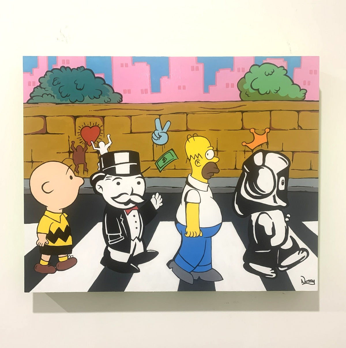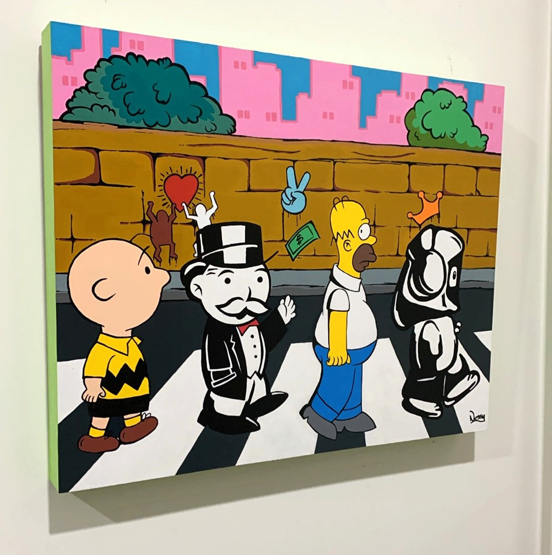 In Do Da Walk, Hoodie Boy leads a surreal procession across a stylized crosswalk—an homage to the Beatles’ Abbey Road, reimagined through the lens of pop culture. Flanked by Charlie Brown, the Monopoly Man, and Homer Simpson, Hoodie Boy anchors the scene with quiet resolve and expressive eyes, stepping forward as a symbol of emotional clarity amid chaos.