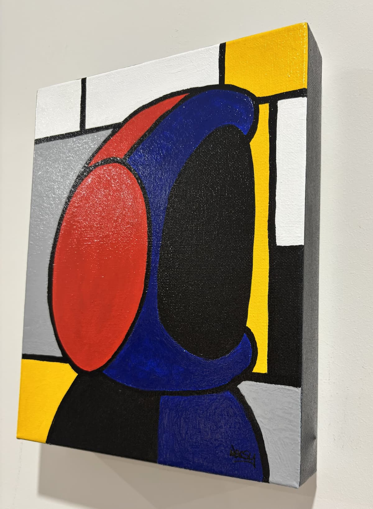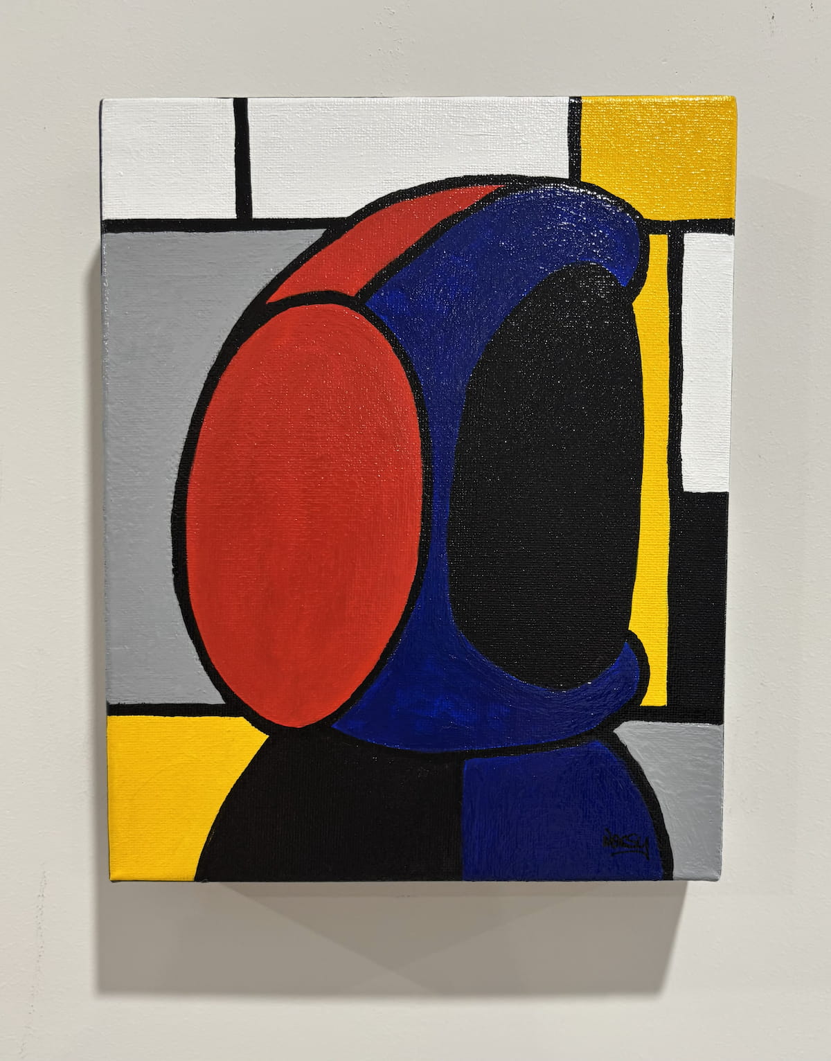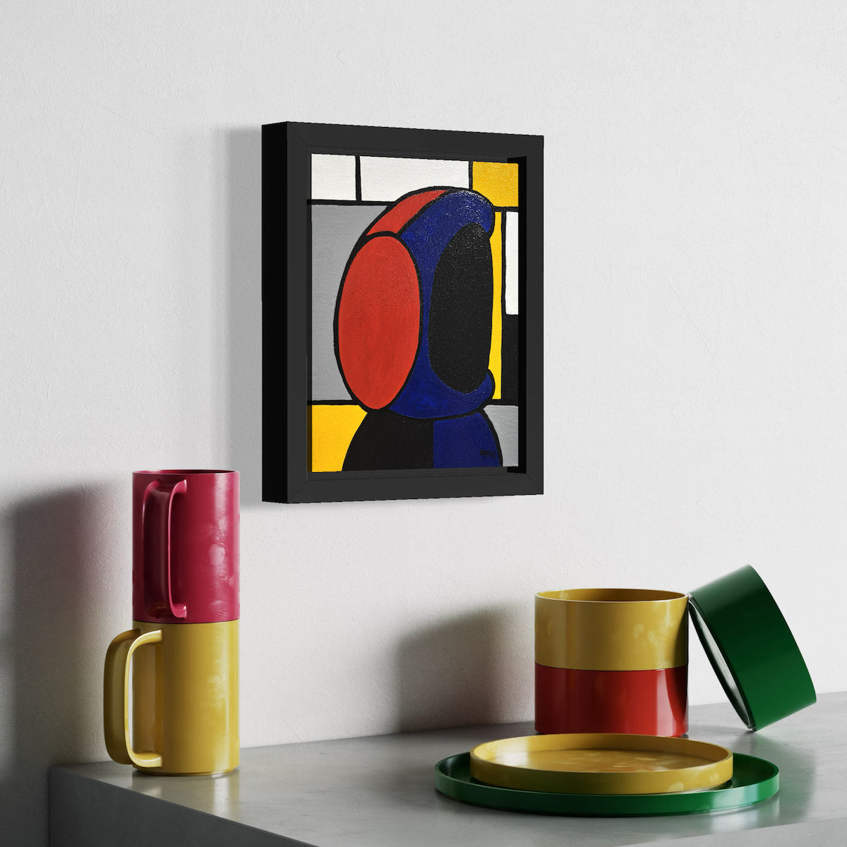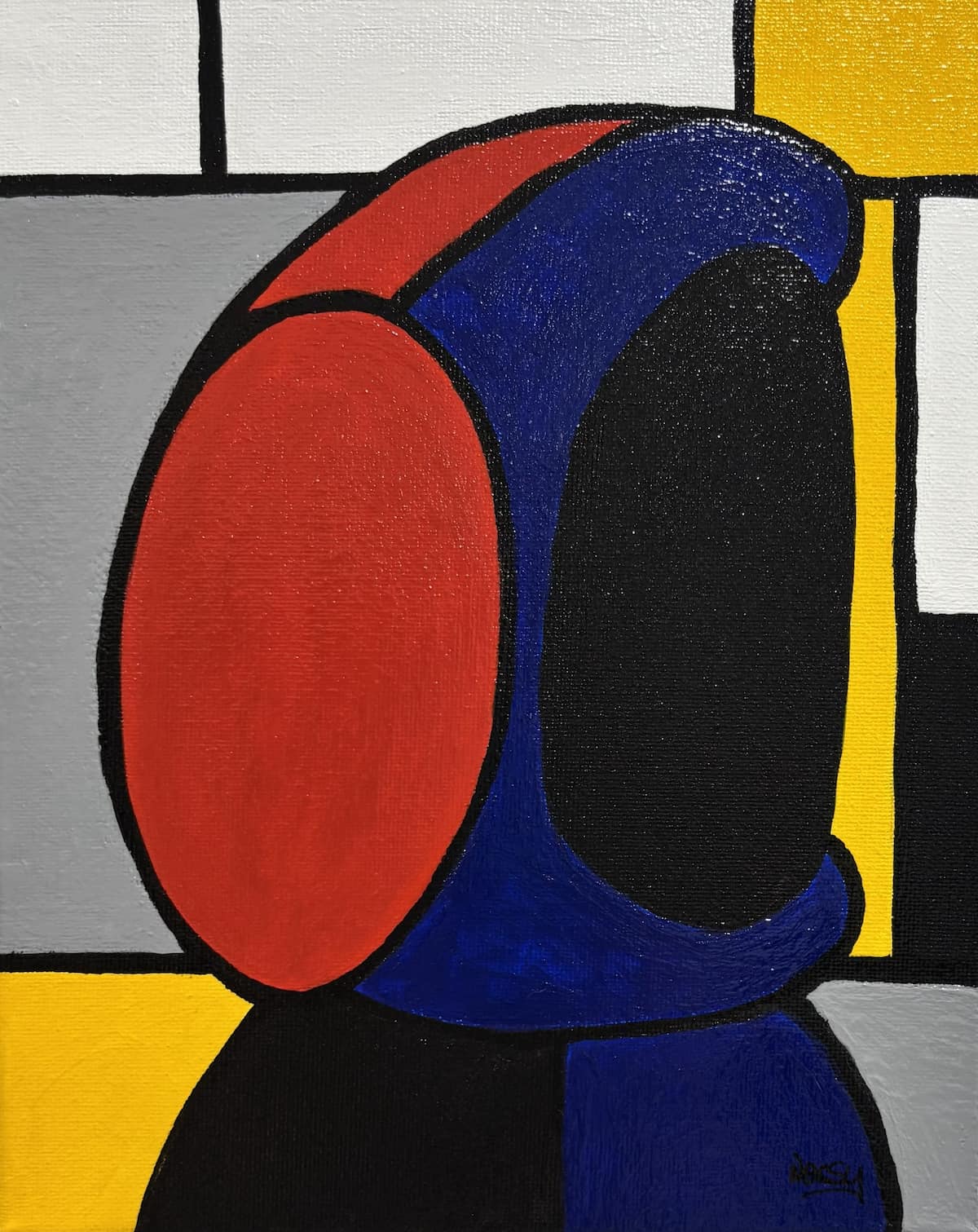Blue hoodie. Red headphones. A lone figure suspended inside a world of lines and colour. The grid is an echo of Mondrian — order, balance, intention. A quiet structure holding a modern character who doesn’t quite fit the rules.