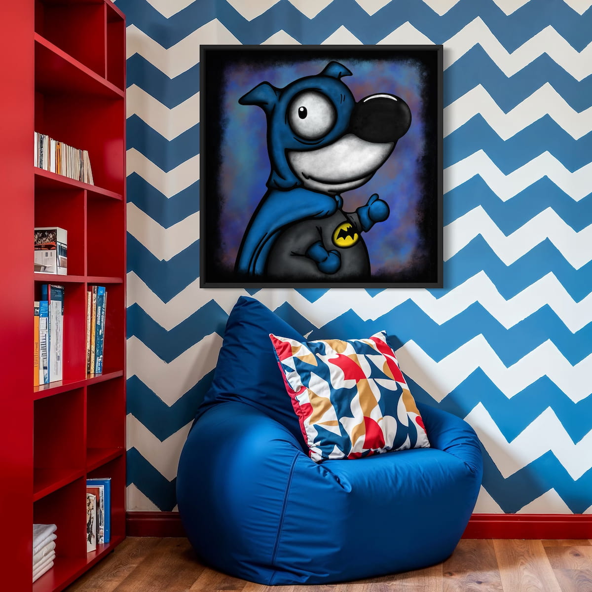 Ness flips the brooding bat mythos into something cheeky and bold. The deep blues and purples swirl behind him like a midnight sky, the yellow logo pops, and our hero dog beams like justice is just a game he’s winning.