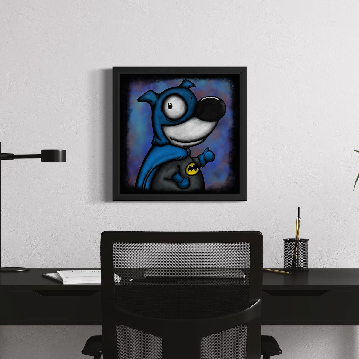 Cowl on, cape out, grin wide — this pup’s got Gotham covered. With eyes that say “I know what you did,” and a stance that’s all shadow and swagger, he’s the canine crusader we didn’t know we needed.